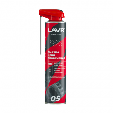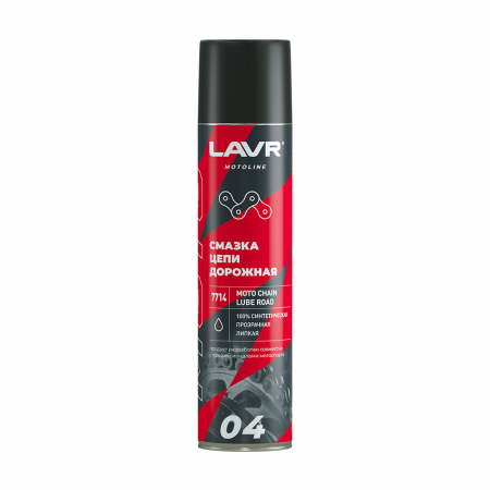 LAVR MOTO Смазка цепи Дорожная, 400мл это липкая синтетическая смазка для быстродвижущихся цепей мототехники. Специально разработана для дорожных мотоциклов с уплотнителями типа О-ring, X-ring, Z-ring и без уплотнителей. Образует смазывающую пленку, стойкую к воздействию воды и грязи. Защищает сальники цепи независимо от нагрузок и скоростей. Увеличивает срок службы цепи, уменьшая трение.