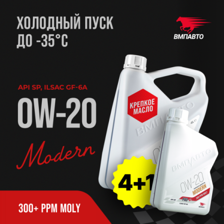 ВМПАВТО Масло моторное синтетическое MODERN 0W-20 SP GF-6A 4л+1л это cинтетическое универсальное моторное масло на основе смеси полиальфаолефинов(PAO), высокоочищенного масла VHVI, алкилированных нафталинов(AN) и эфиров. Имеет в составе улучшенный пакет присадок, предназначенный для самых современных автомобилей и обеспечивающий максимальную энергоэффективность и высокий уровень защиты ДВС от износа.